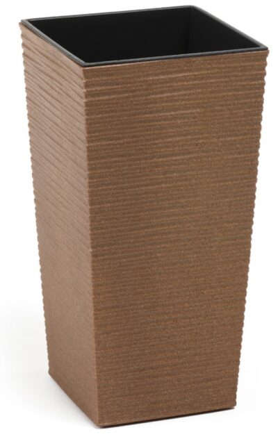 Donica sprzedawana jest razem z wkładem ,który nie ma otworów w dnie.Jest łatwa w czyszczeniu i odporna na zarysowania.Faktura doniczki przypomina rzeźbienie dłutem.Idealnie pasuje do wnętrz na taras lub balkon.
